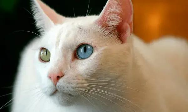 Sin embargo, también puede darse que ambos ojos sean azules, verdes o amarillos. Su impoluto manto blanco está formado por pelo corto, denso y tupido, muy suave al tacto. Algunos ejemplares nacen con una mancha oscura en la cabeza que desaparece al cabo de pocos meses.